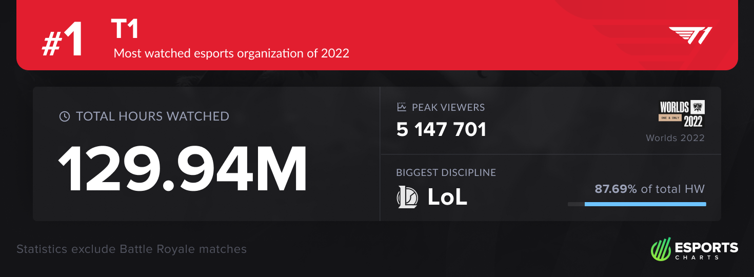 With Faker, arguably esports greatest player of all time, as the team captain, they managed to win the LCK Spring Split, while not losing a single series. They also came second in the LCK Summer Split, and achieved the same result at Worlds 2022, where they lost in what many are calling the best finals in the history of the tournament. It was in that final that the team achieved its Peak Viewership, with 5.1 million viewers gathering to watch the battle between Faker and Deft. Worth noting that, despite having less airtime in 2022, T1 viewership grew, and 254K concurrent viewers would tune into the organization's games regularly.