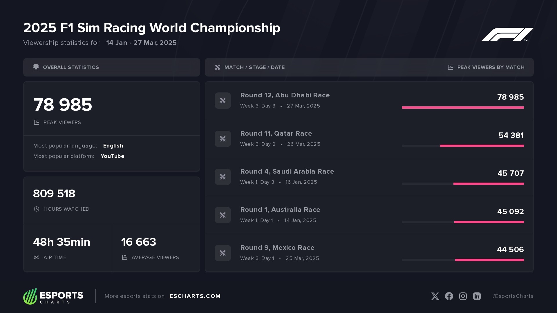 The 2025 F1 Sim Racing World Championship races took place in multiple stages from January 1 to March 27. Overall, the tournament's streams amassed over 809,500 Hours Watched. The peak viewership hit 78,985 concurrent viewers during the final race, setting a new record for the highest audience in the history of the racing series.