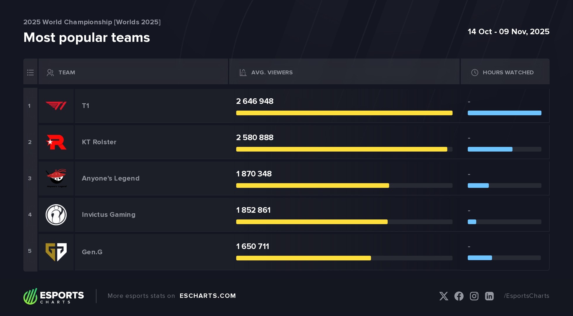 As League of Legends fans keep buzzing about the 2025 World Championship final, the Esports Charts team is rolling out some fascinating tournament analytics. In this article, we’re sharing data for free that’s usually reserved for PRO subscribers. Discover which team topped the charts in total watch ешьу and average concurrent viewers, and see which team sneaked into the second ranking without even making it to the Knockout Stage.