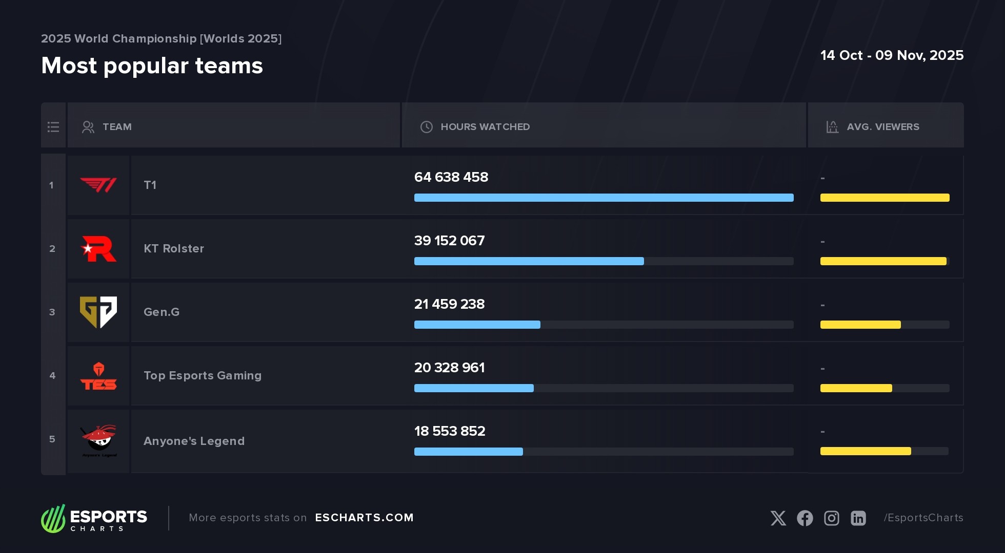 KT Rolster, the other finalist, claimed the second spot in total watch hours. They trailed the leader by a wide margin, largely because they played very few series in the Swiss Stage. Rounding out the top three was another South Korean team, Gen.G, who were knocked out in the semifinals.