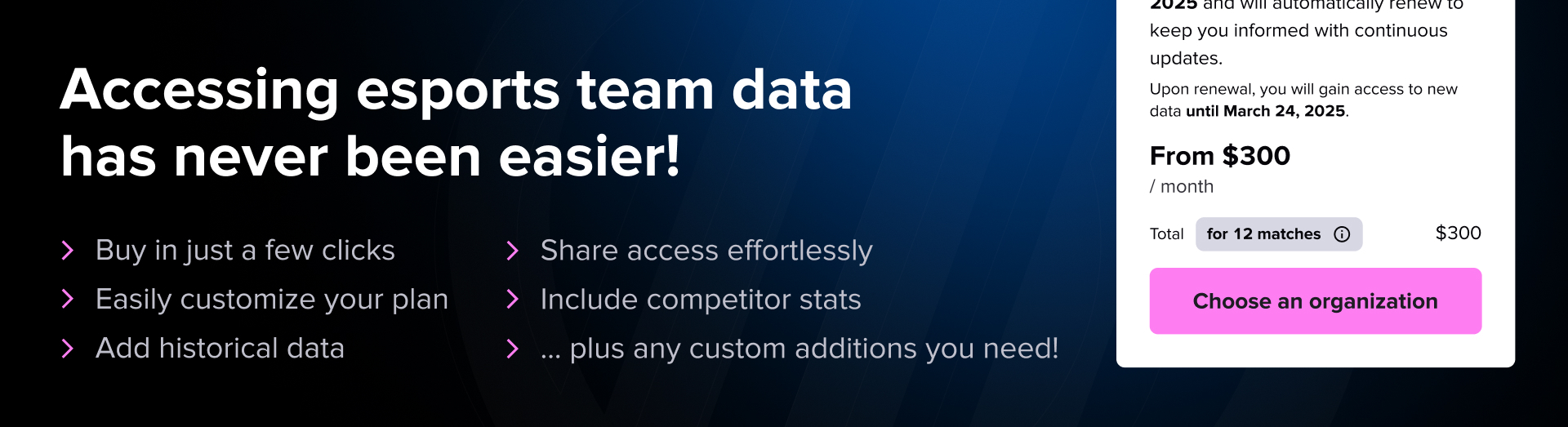 Detailed Esports data at your fingertips.