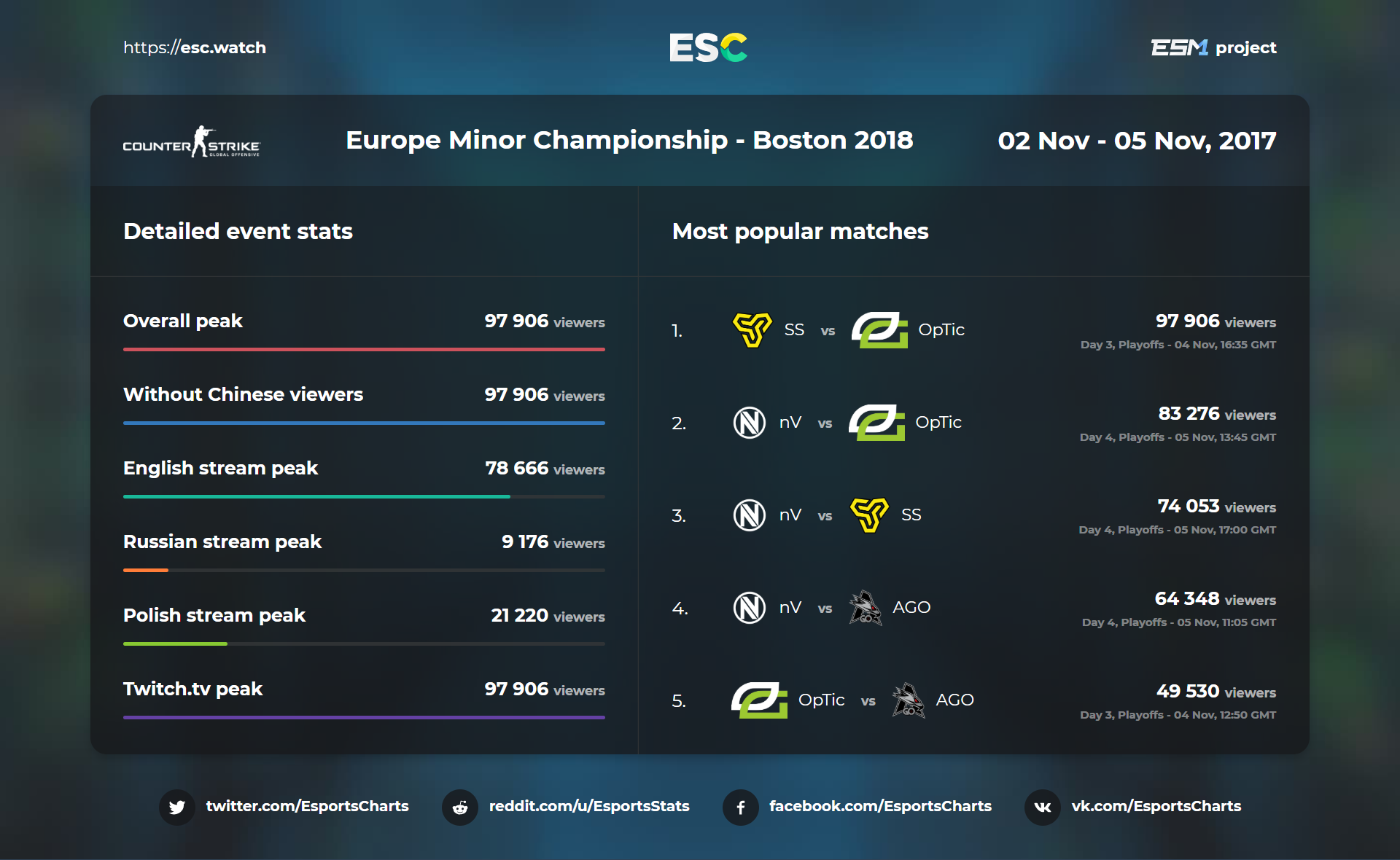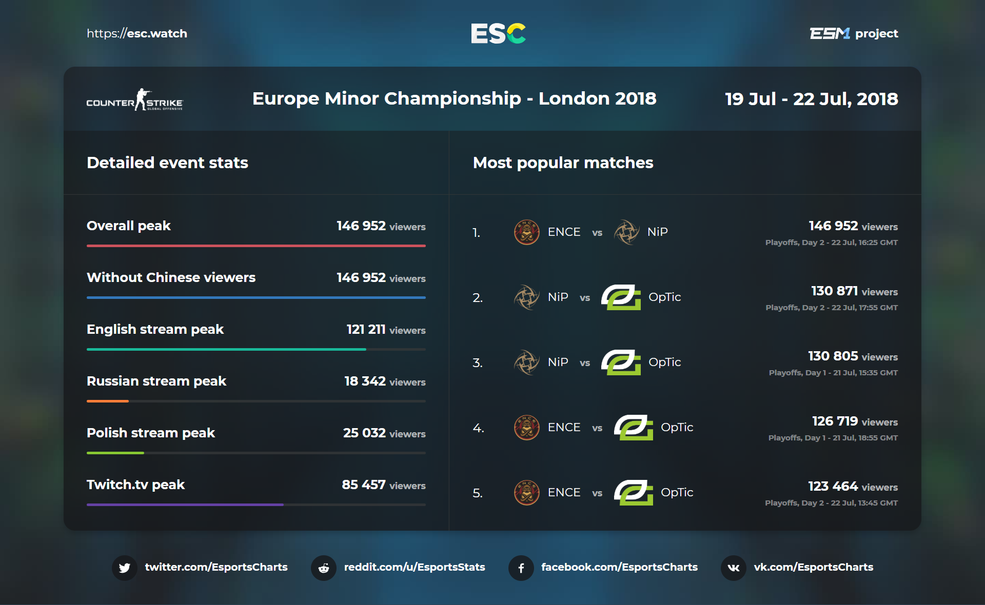 We can conclude this by stating that it is FaceIT’s event that's currently at the peak of popularity. At the same time, ESL has proven itself to be a worthy rival, reaching a close enough position – instead of lagging far behind like the guys from ELEAGUE, who have both surprised and disappointed us.