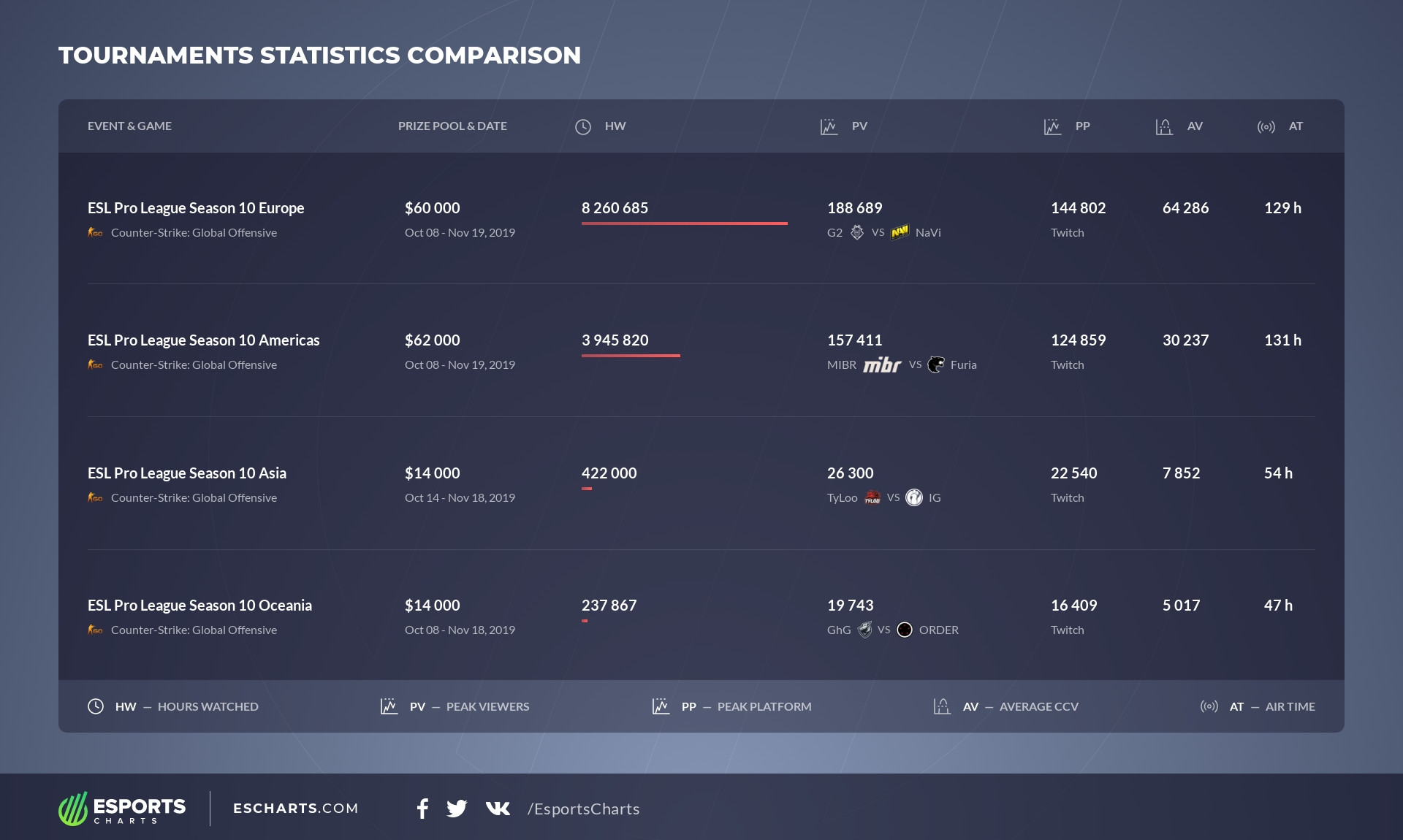 The ESL Pro League Season 10 Europe is once again at the top, but this time by the average broadcast viewers. The championship for teams from Oceania earns the last spot once again as well.