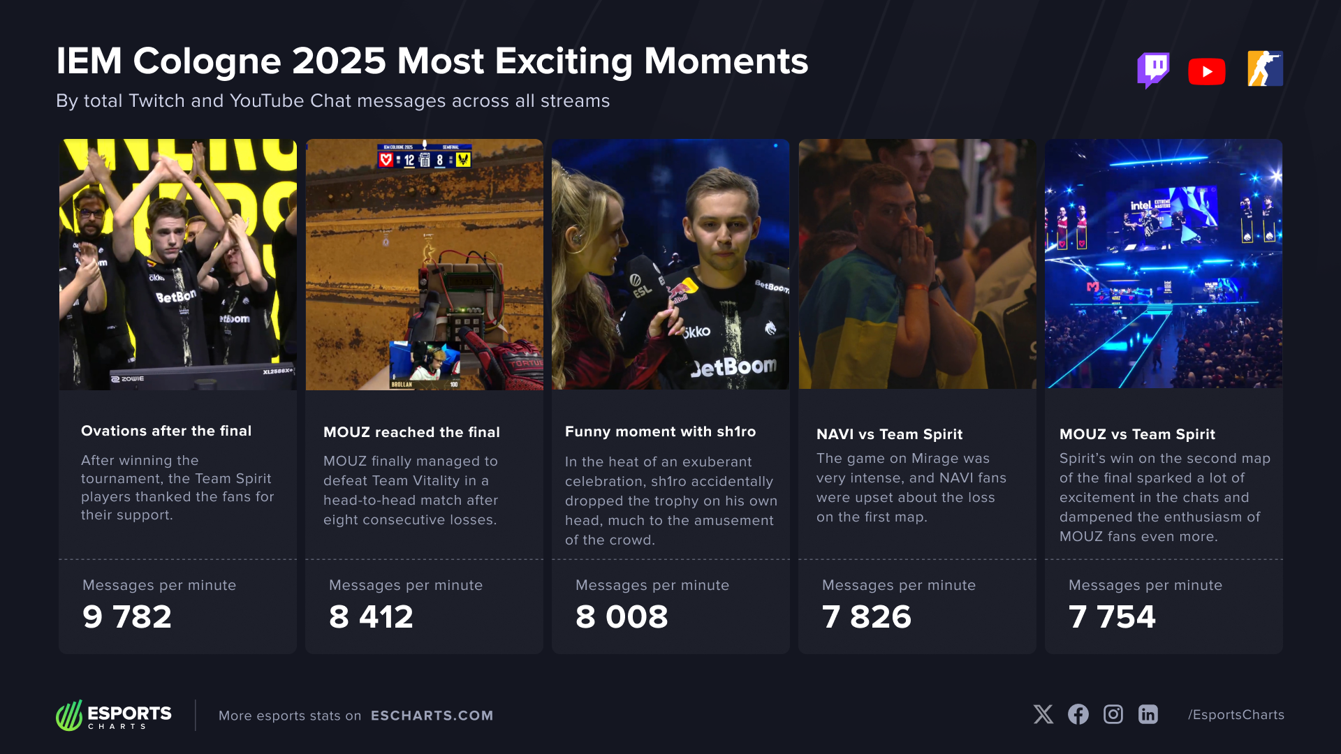 The most thrilling moments in tournaments don’t just attract the largest audiences, they also spark the hottest discussions in live chat. Esports Charts wraps up the recently concluded IEM Cologne 2025 by highlighting five standout moments that generated the biggest reactions from viewers on Twitch and YouTube. From clutch winning rounds to unforgettable funny moments, this list captures the event’s most talked-about highlights.