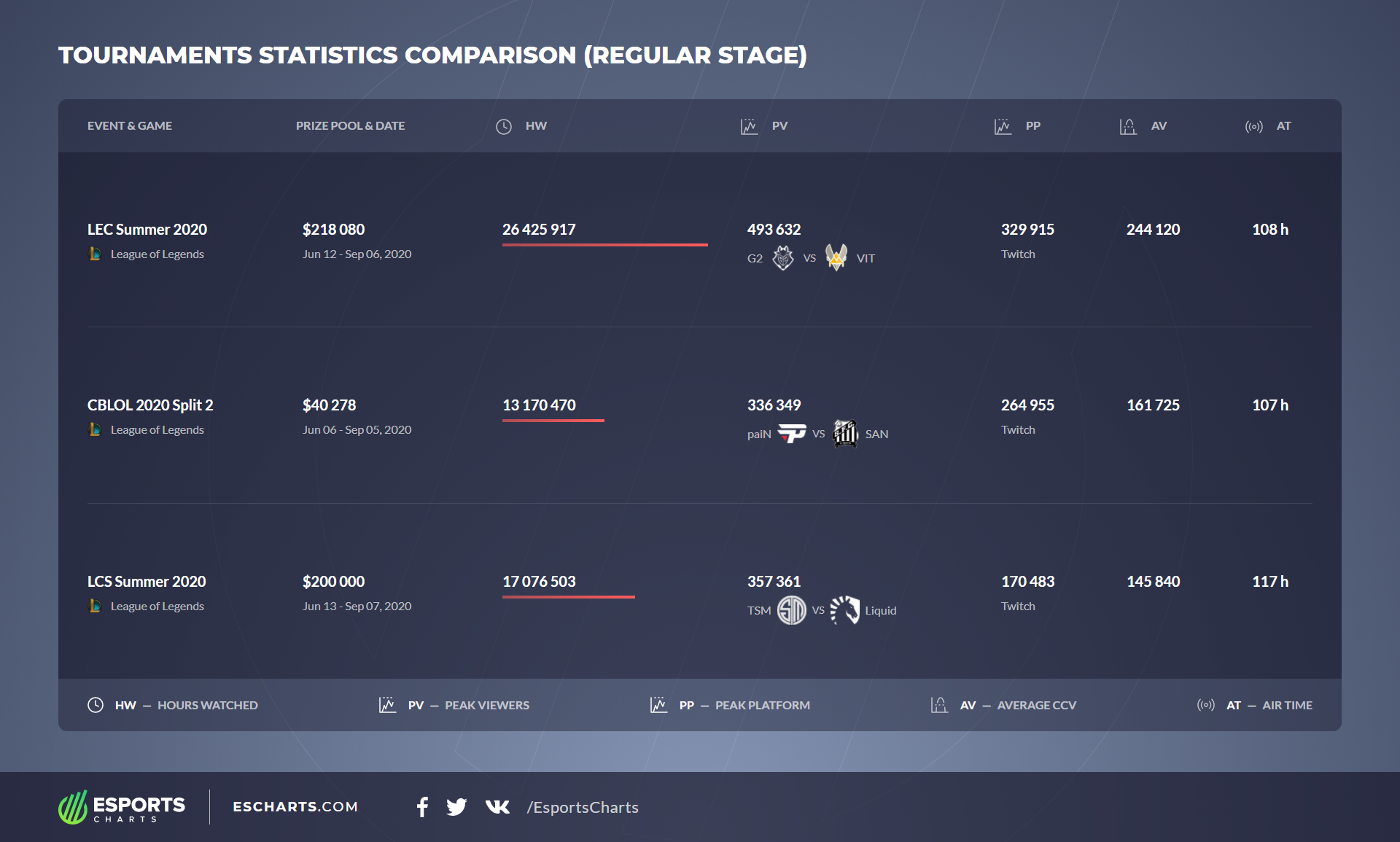 Europe has the best viewability results when compared to the other region. The matches at LEC have attracted 244 thousand average viewers. Compared to 145 thousand average viewers of LCS, that's a 40% worth gap between the tournaments. It should be understood that therefore LCS already has fewer viewers than the Brazilian CBLOL – which is a not-so-positive trend.