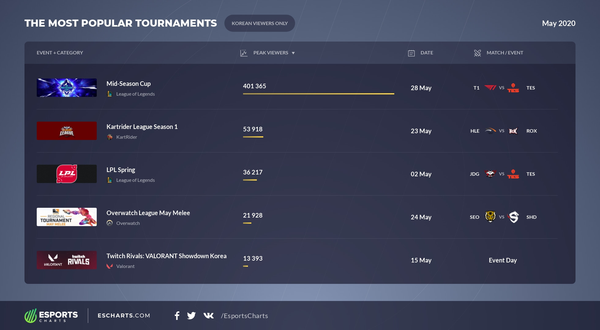 Kartrider League Season 1 is on the second place. It was organized by the game devs and it took place from January to May. The viewers' peak compared to the Mid-Season Cup 2020 is certainly much smaller - 53K spectators.