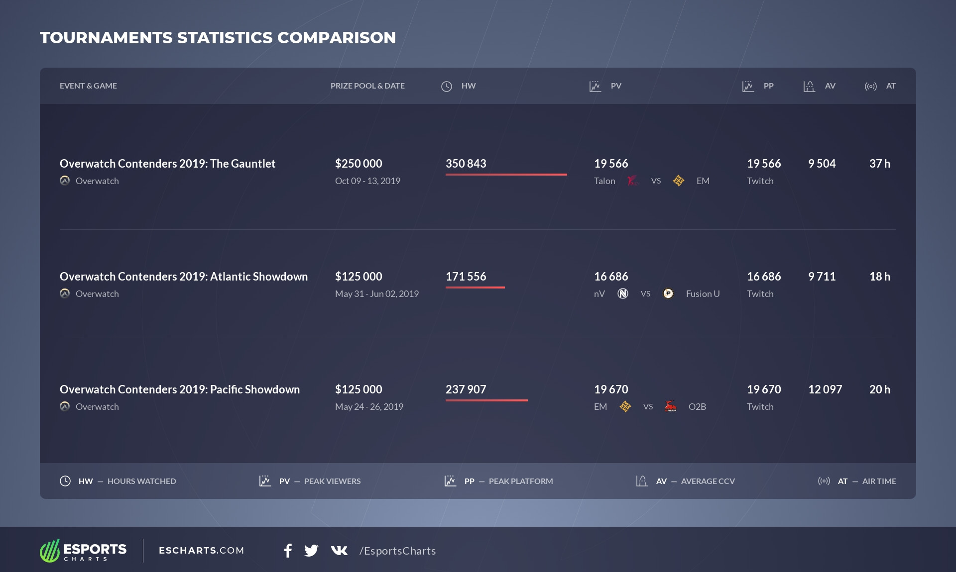 If you are interested in more detailed statistics on Overwatch Contenders: The Gauntlet, then you can use our paid Esports Charts Pro subscription.