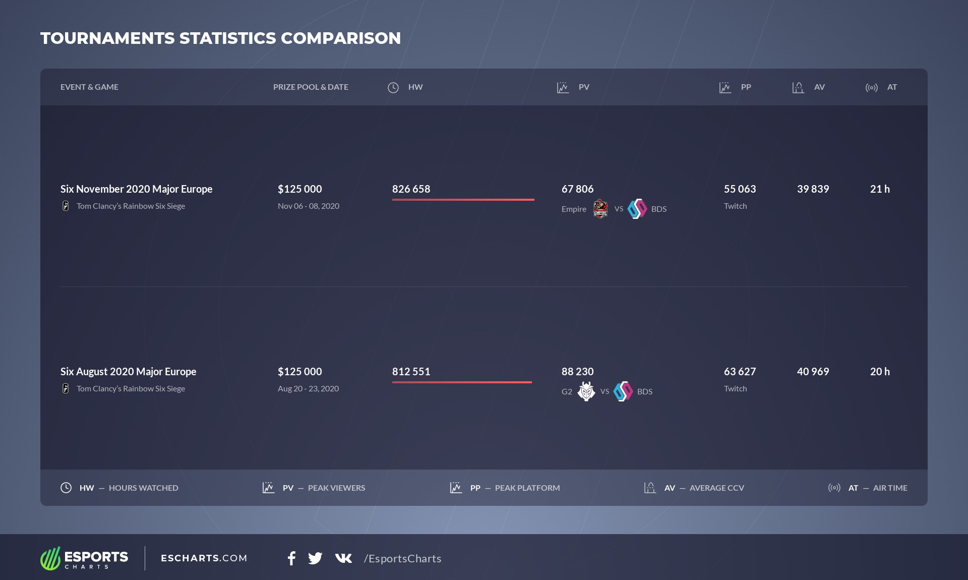 Unlike the American tournament, the indicators of Six November 2020 Major Europe showed a decrease compared to the series’ previous tournament. Compared to the Six August 2020 Major Europe, the European event lost 13% and 2,4% in terms of peak and average viewers, respectively.
