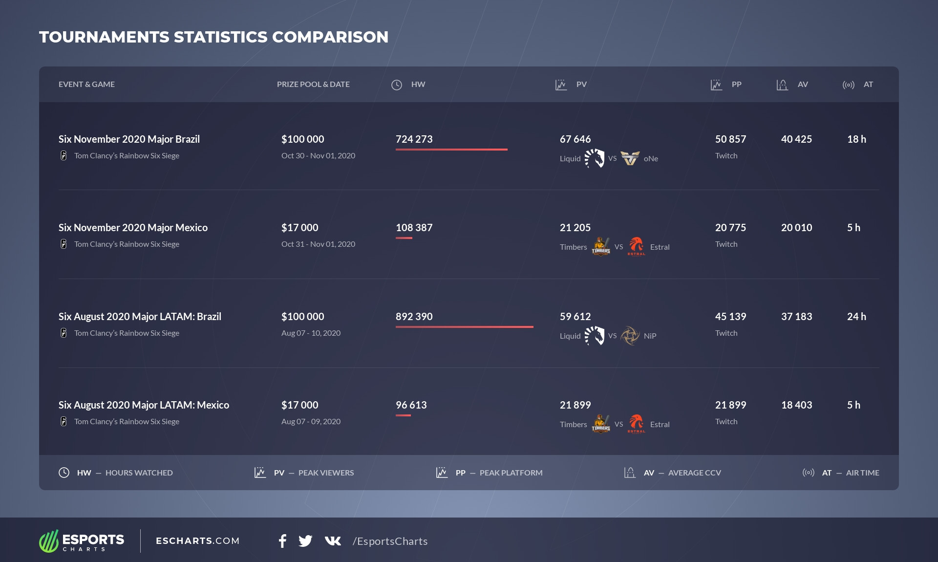 The Brazilian tournament was the more popular of the two, with its final being watched by 67 thousand peak viewers. Also, when compared to the previous competition in the series, the peak and average viewers of Six November 2020 Major Brazil were improved by 13% and 8%, respectively.