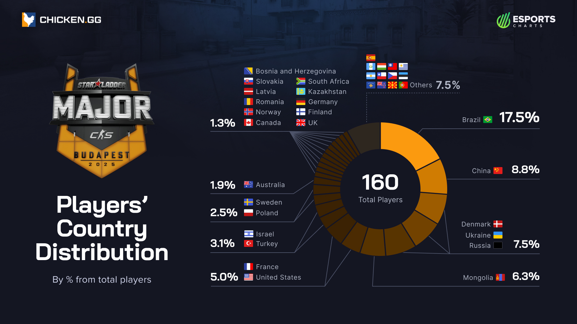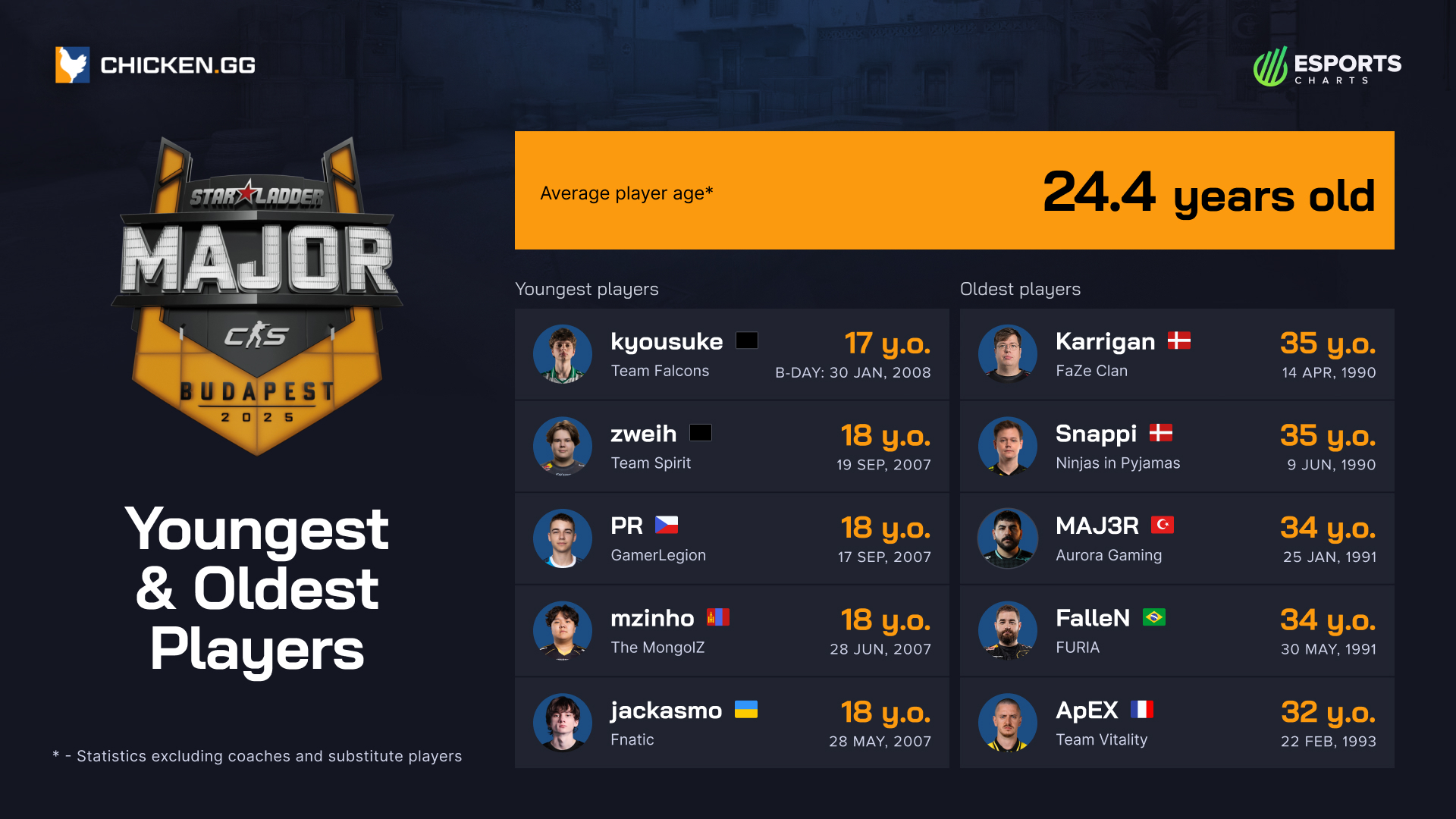 In partnership with Chicken.gg, we break down the demographics behind every roster heading to Budapest. From the oldest and youngest squads on average to the nationalities that gained — or lost — representation compared to previous Majors, these snapshots offer a sharper view of who’s carrying the competitive torch into the season finale.