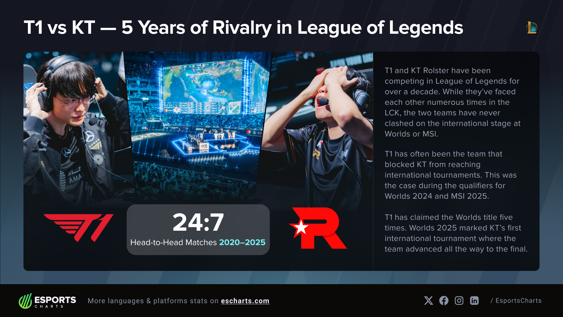 On November 9, T1 and KT Rolster will clash in the grand final of the 2025 League of Legends World Championship, where the season’s best team will finally be crowned. The fight for the title promises to be fierce, and the hype is only intensified by the historic rivalry between these two Korean powerhouses. In this article, Esports Charts dives into the roots of the T1-KT feud, the meaning behind the legendary “Telecom wars”, and what to expect from their long-awaited showdown this year.