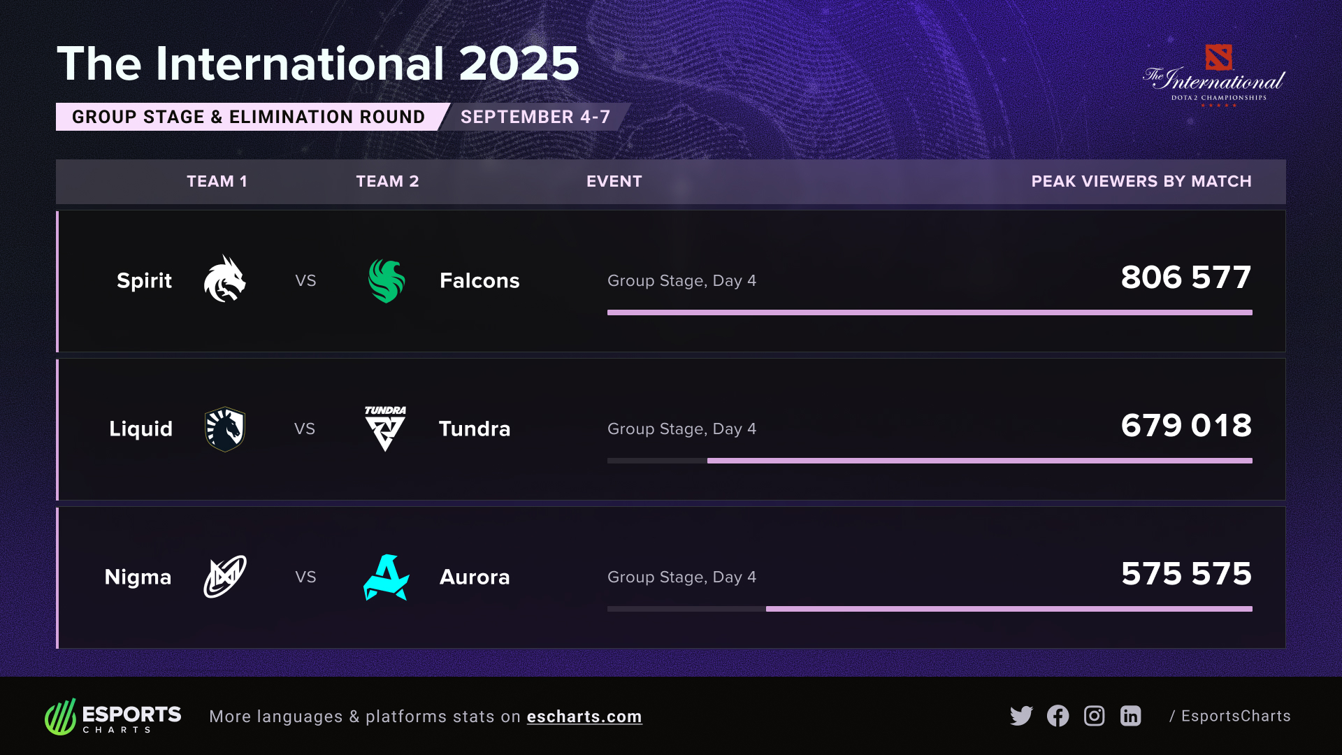 The biggest match of The International 2025’s early stages was the Elimination Round showdown between Team Spirit and Team Falcons. The two-time champions suffered a surprising defeat, bowing out of the tournament before the playoffs even began. Rounding out the top three most-popular matches were the elimination clashes of Team Liquid vs. Tundra Esports and Nigma Galaxy vs. Aurora Gaming.