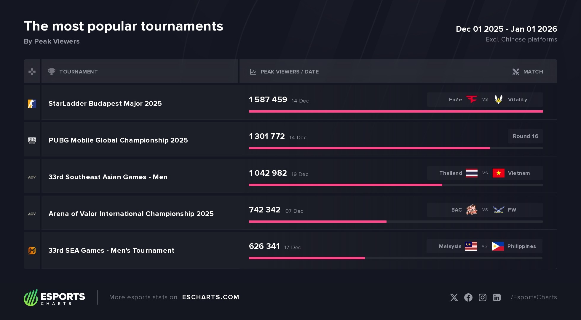 Rounding out the top five was another SEA Games event, this time featuring Mobile Legends: Bang Bang. While MLBB finished behind Arena of Valor in December, its inclusion once again underscored the growing importance of multi-discipline events like the SEA Games as major drivers of peak esports viewership at the end of the year.