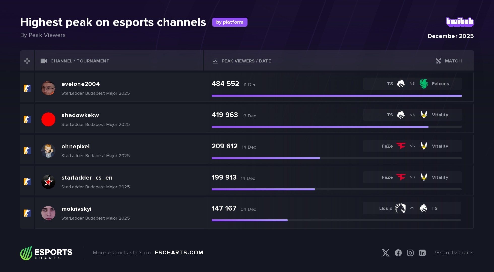When it comes to overall peak viewership, December’s leaderboard was topped by the StarLadder Budapest Major 2025. The Counter-Strike Major peaked at over 1.5 million concurrent viewers during the grand final between FaZe Clan and Team Vitality. While the figure fell short of all-time records, it remains a very strong result for an event that had to operate under unusually complex conditions. Different platform restrictions forced StarLadder to run separate broadcast feeds across platforms, adding significant operational challenges without diluting audience interest. We explored those realities in detail in our interview with StarLadder, where the organizer broke down what it takes to deliver a Tier-S event under modern platform constraints.
