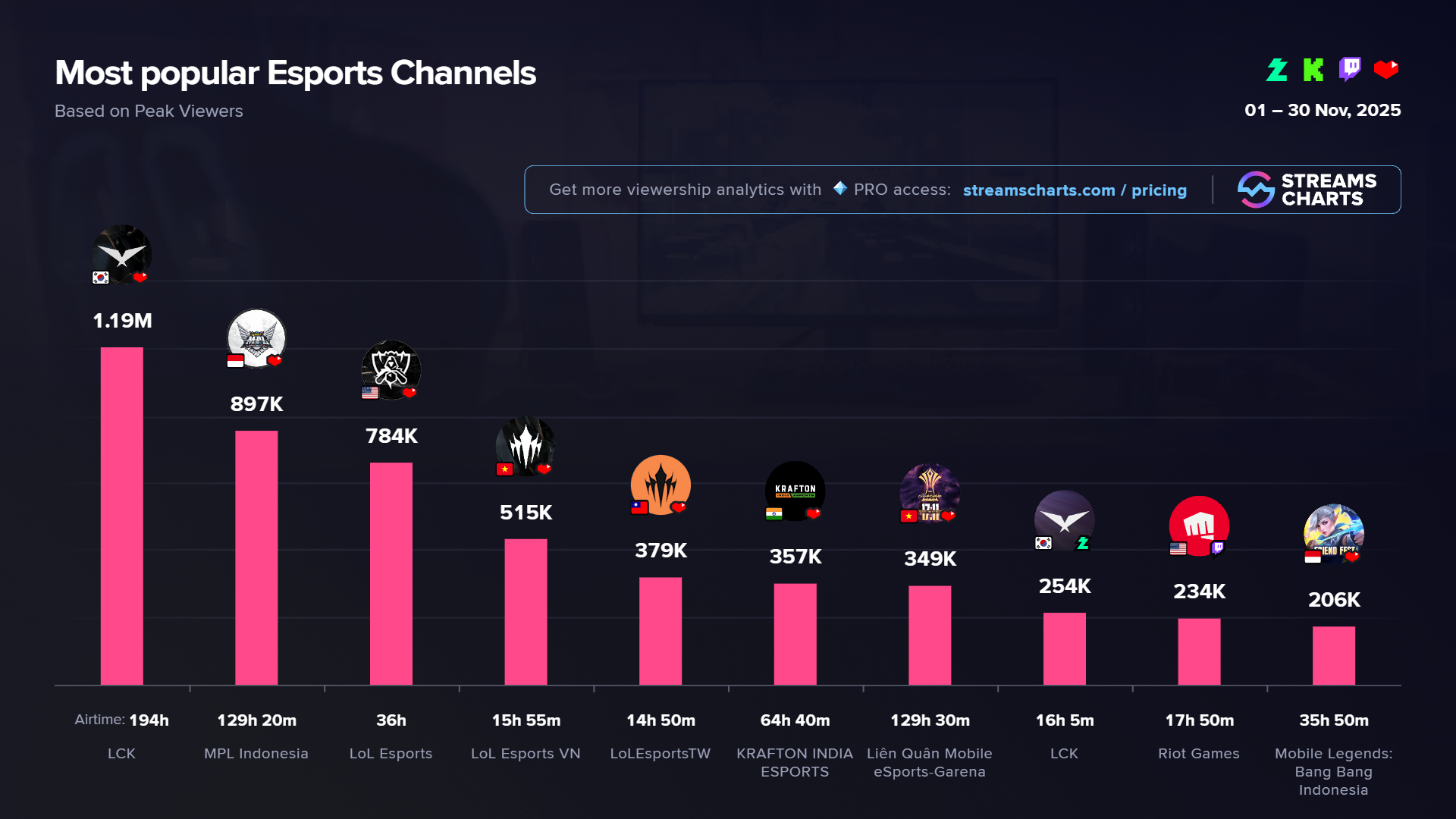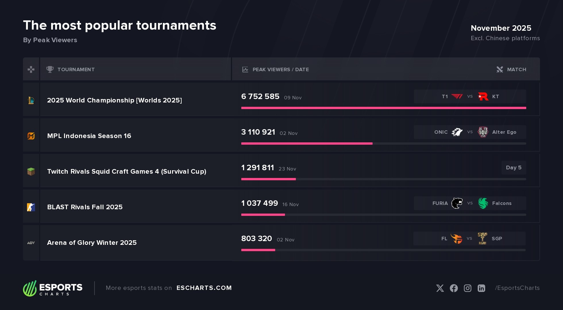 The most popular esports event in November was the 2025 World Championship, the final League of Legends tournament of the year. The event peaked at more than 6.75 million viewers during the grand finals matchup between T1 and KT Rolster. Many fans anticipated a new all-time viewership record, but the tournament ultimately fell just short of surpassing the 2024 World Championship — although it came very close.