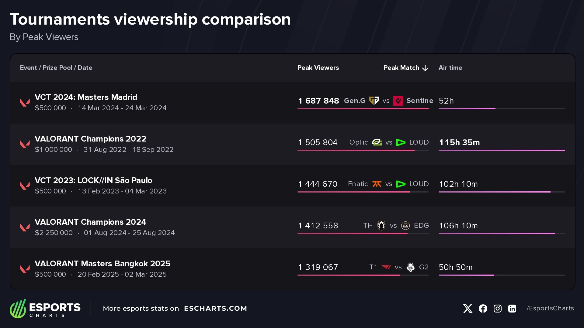 According to Esports Charts, VALORANT Masters Bangkok 2025 ranked in the top 5 most popular tournaments in the Valorant Masters series, placing 2nd. It’s worth noting that our statistics don’t account for data from Chinese streaming platforms. The organizers reported that the tournament peaked at over 4.3 million viewers, making it the most popular event in the history of the series.