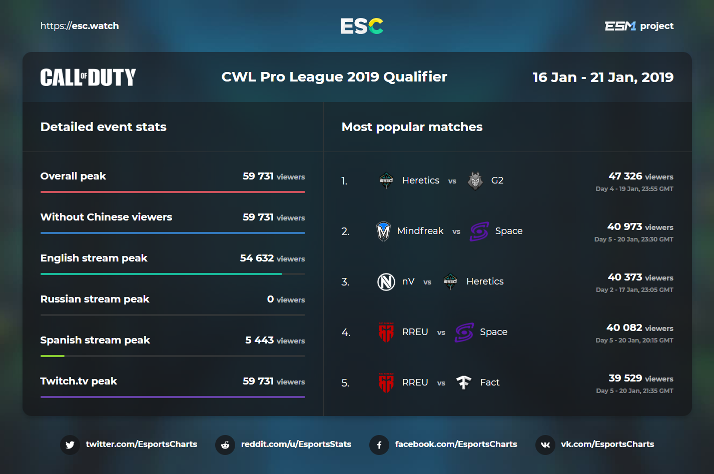 Call of Duty, this leader of American market, seems to be the next target of Spain and Latin America. The players from Heretics KFC have shown the top performance during the last qualifier of CWL Pro League 2019. Their participation has resulted in Spanish-language broadcast peaking at 5 thousand spectators.