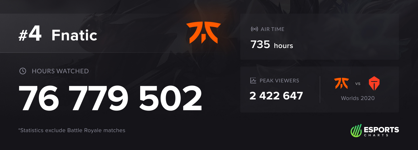 Несмотря на не самые лучшие результаты, матчи команд Fnatic за 2020 год набрали 76,8 млн часов просмотра — +3,4 млн за год. Но, как и в случае с Astralis, этого оказалось мало: клуб опустился с третьей на четвертую строчку рейтинга.