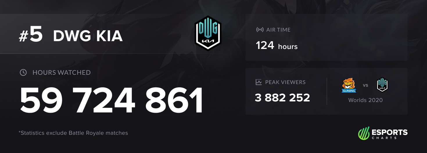 Примечательно, что DWG KIA — единственная организация из топ-10, у которой есть только один действующий киберспортивный состав. Также заметим, что именно DWG KIA принадлежит рекорд сезона-2020 по пиковой аудитории, который был установлен в финале чемпионата мира: за противостоянием корейцев с китайской командой Suning одновременно следили 3,8 млн человек.