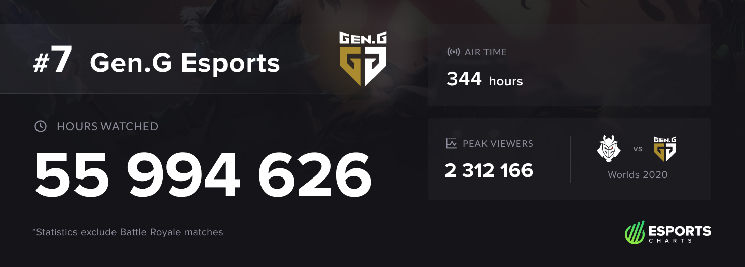 Карлосу ocelote Родригезу можно только аплодировать — каждый день он ведет свою организацию к новым вершинам. По итогам 2020 года именно G2 Esports стала самой популярной киберспортивной организацией года. Отметим, что клуб набрал на 9,3 млн часов просмотра меньше, чем в 2019-м, однако это не помешало организации занять первую строчку рейтинга. Отметим, что по итогам года G2 также была признана лучшей киберспортивной командой/организацией на The Game Awards и The Esports Awards: как видим, часто статистика совпадает с мнением аудитории.