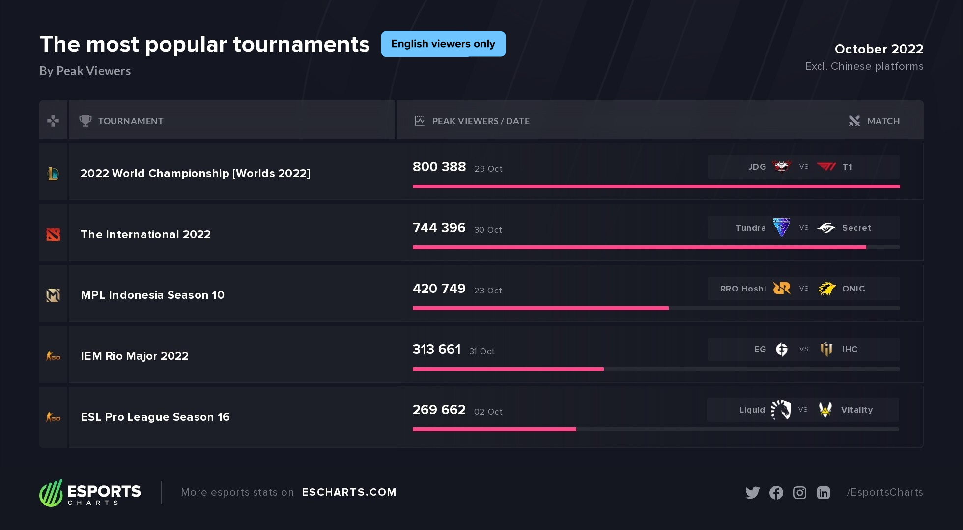 Самым популярным турниром октября среди англоязычной аудитории стал Worlds 2022, за полуфиналом которого (JD Gaming против T1) на пике следили 800,4 тыс. зрителей языкового сегмента. TI11 расположился на втором месте, собрав во время гранд-финала 744,4 тыс. англоязычных зрителей одновременно. Топ-3 замкнул MPL ID S10, за решающим матчем которого следили 420,7 тыс. представителей языкового сегмента.