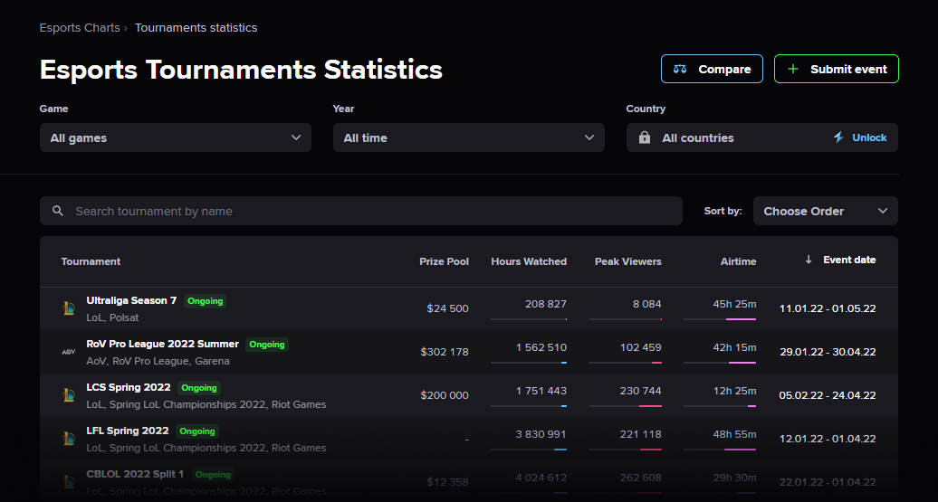 Важно помнить о том, что мы ведем статистику различных игровых и стриминговых событий, которые также по желанию можно включить в сортировку. Кроме того, со временем в качестве платной функции станет доступна фильтрация по странам проведения соревнований.