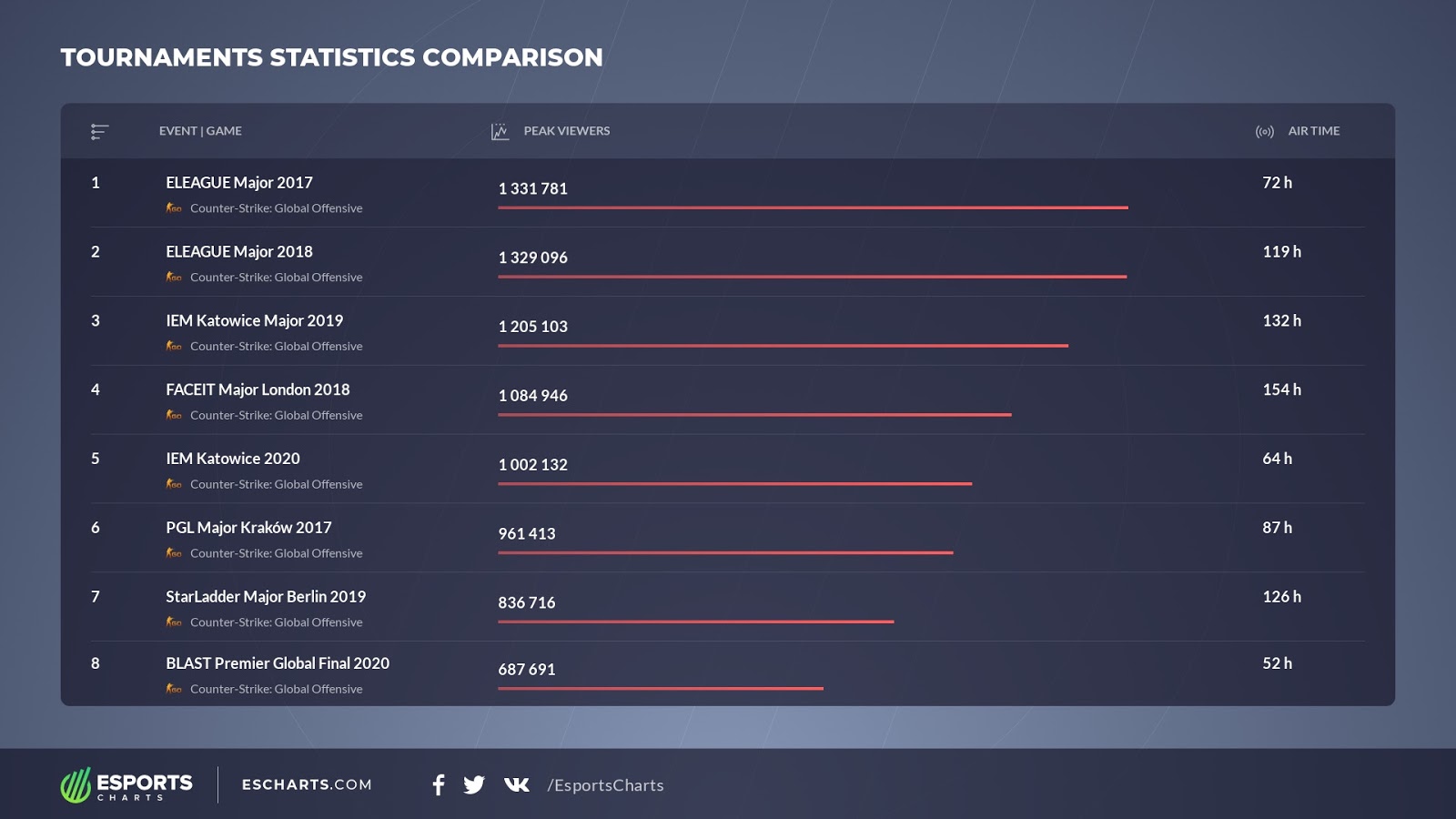 BLAST Premier: Global Final 2020 стал вторым по популярности турниром в истории CS:GO, не носящим статус мейджора. Первенство уступило только прошлогоднему IEM Katowice, который в пике собрал более миллиона зрителей. Но примечательно, что BLAST обошел IEM по средней аудитории — 317 тысяч человек против 279 тысяч.