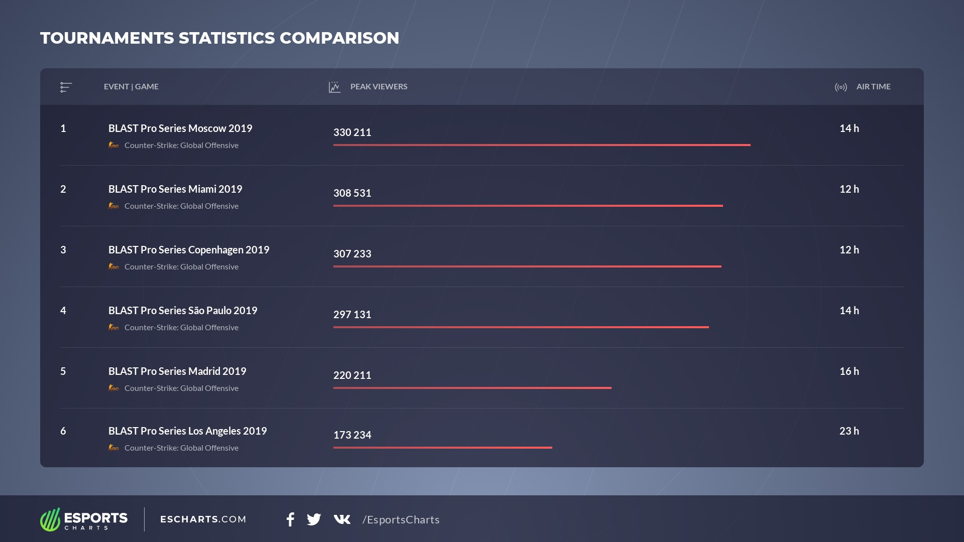 BLAST Pro Series Moscow became the most popular stop of the series based on the peak viewers. The Russian event got this result thanks to the guys from Natus Vincere. The audience of this region has always loved CS:GO, and simply couldn't miss the home championship.